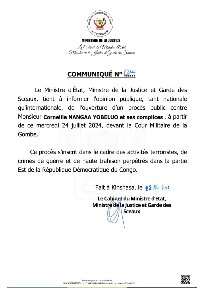 Dans une annonce majeure, le ministère de la Justice et Garde des Sceaux, Constant Mutamba a communiqué l’ouverture d’un procès public contre Monsieur Corneille NANGAA YOBELUO et ses complices. Le procès se tiendra devant la Cour Militaire de la Gombe et débutera ce mercredi 24 juillet 2024.